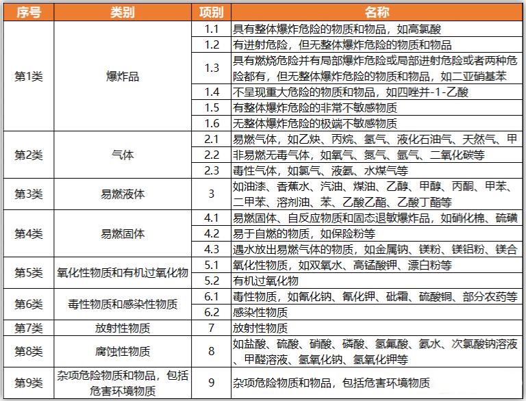 根據GB 6944-2012【1】《危險貨物分類和品名編號》,危化品主要可分為九大類: